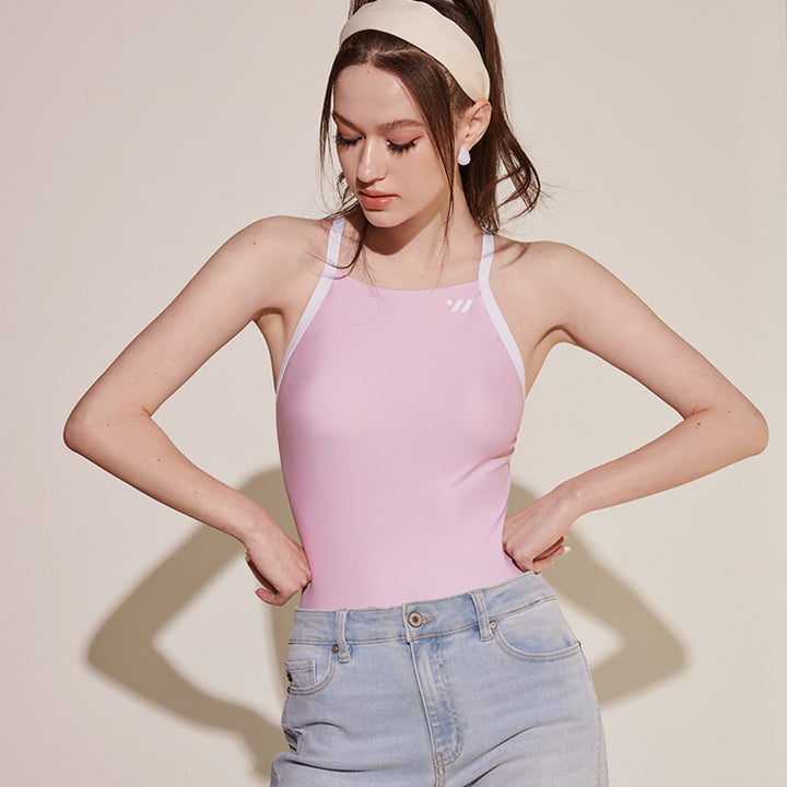Semi halterneck with cross A-back straps to aid freedom of movement.